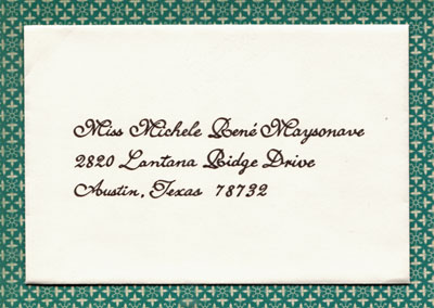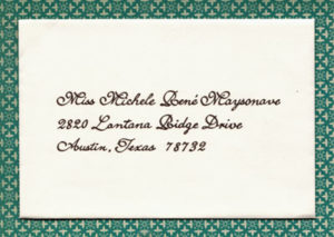 First, that my biggest obstacle in selling my services is not exposure or price. It is the presumption that “elegant” or “beautiful” equals “expensive”. This is simply not true. I’m not saying that there isn’t expensive calligraphy out there, just that it doesn’t necessarily have to be. Just like you’ll try on gowns or suits in different price ranges until you find one you love that also fits your budget, so should you price several calligraphers until you find someone who fits your budget and gives you what you want.